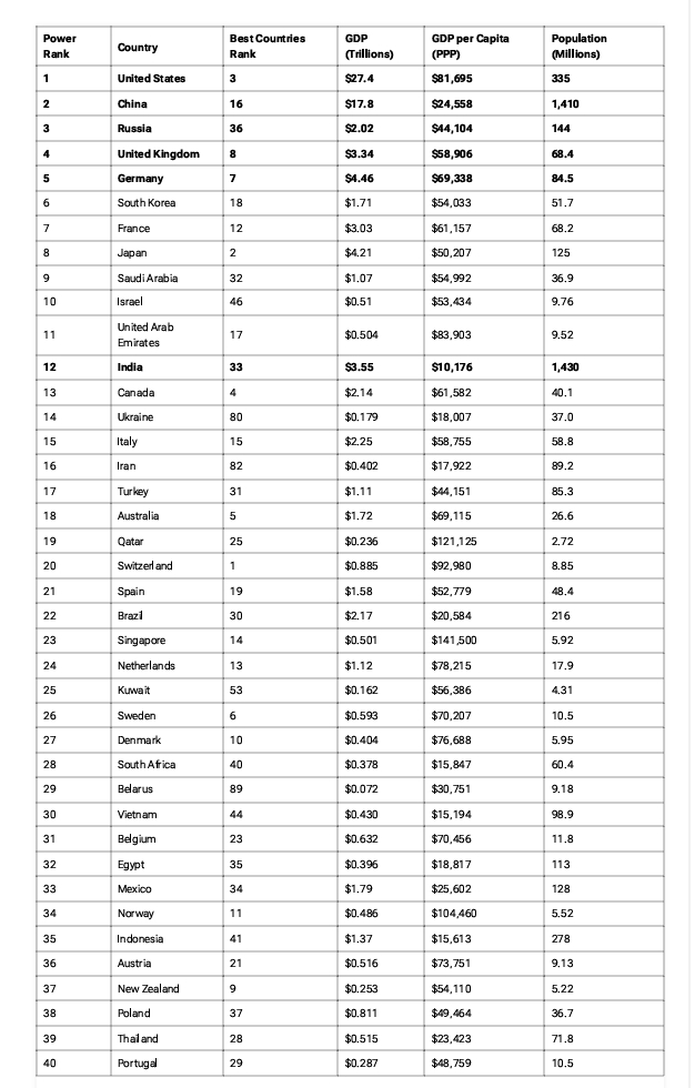 ਦੁਨੀਆ ਦੇ ਦਸ ਸ਼ਕਤੀਸ਼ਾਲੀ ਦੇਸ਼ ਕ੍ਰਮਵਾਰ ਹਨ,