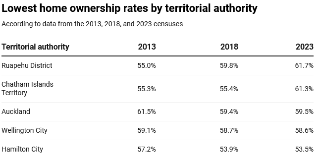 ਰਾਸ਼ਟਰੀ ਪੱਧਰ ‘ਤੇ, 2023 ਦੀ ਮਰਦਮਸ਼ੁਮਾਰੀ ਨੇ 66٪ ਦੀ ਘਰ ਦੀ ਮਾਲਕੀ ਦਰ ਦਰਸਾਈ, ਜਿਸਦਾ ਮਤਲਬ ਹੈ ਕਿ 1.17 ਮਿਲੀਅਨ ਕੀਵੀ ਆਪਣੇ ਘਰ ਦੇ ਮਾਲਕ ਹਨ ਜਾਂ ਇਸ ਨੂੰ ਪਰਿਵਾਰਕ ਟਰੱਸਟ ਵਿੱਚ ਰੱਖਦੇ ਹਨ, ਜਦੋਂ ਕਿ 2018 ਵਿੱਚ ਇਹ 64.5٪ ਸੀ। ਨਿਊਜ਼ੀਲੈਂਡ ਦੇ ਪ੍ਰਮੁੱਖ ਵਿਸ਼ਲੇਸ਼ਕ ਰੋਜ਼ਮੈਰੀ ਗੁਡਈਅਰ ਨੇ ਕਿਹਾ ਕਿ ਘਰ ਦੀ ਮਾਲਕੀ ਵਿਚ ਰਾਸ਼ਟਰੀ ਵਾਧਾ, ਹਾਲਾਂਕਿ ਛੋਟਾ ਹੈ, 1990 ਦੇ ਦਹਾਕੇ ਦੇ ਸ਼ੁਰੂ ਵਿਚ ਸਿਖਰ ਤੋਂ ਬਾਅਦ ਗਿਰਾਵਟ ਦੇ ਰੁਝਾਨ ਨੂੰ ਉਲਟਾ ਹੈ. ਗੁਡਈਅਰ ਨੇ ਕਿਹਾ, “ਘਰ ਦੀ ਮਾਲਕੀ ਦੀਆਂ ਦਰਾਂ ਕਈ ਕਾਰਕਾਂ ਦੁਆਰਾ ਪ੍ਰਭਾਵਿਤ ਹੁੰਦੀਆਂ ਹਨ, ਖਾਸ ਕਰਕੇ ਸਮਰੱਥਾ, ਅਤੇ ਅਸੀਂ ਜਾਣਦੇ ਹਾਂ ਕਿ ਸ਼ਹਿਰ ਦੇ ਕੇਂਦਰਾਂ ਵਿੱਚ, ਖਾਸ ਕਰਕੇ ਆਕਲੈਂਡ ਅਤੇ ਵੈਲਿੰਗਟਨ ਵਿੱਚ ਮਕਾਨ ਦੀਆਂ ਕੀਮਤਾਂ ਸਭ ਤੋਂ ਵੱਧ ਹੁੰਦੀਆਂ ਹਨ, ਜਦੋਂ ਕਿ ਹੋਰ ਘਰ ਵਧੇਰੇ ਕਿਫਾਇਤੀ ਹੋ ਸਕਦੇ ਹਨ। “ਅਸੀਂ ਇਹ ਵੀ ਜਾਣਦੇ ਹਾਂ ਕਿ ਬਜ਼ੁਰਗ ਲੋਕਾਂ ਵਿੱਚ ਘਰ ਦੀ ਮਾਲਕੀ ਦੀਆਂ ਦਰਾਂ ਵਧੇਰੇ ਹਨ, ਇਸ ਲਈ ਅਸੀਂ ਇੱਕ ਪੈਟਰਨ ਵੇਖਦੇ ਹਾਂ ਜਿੱਥੇ ਬਜ਼ੁਰਗ ਆਬਾਦੀ ਵਾਲੇ ਖੇਤਰਾਂ ਵਿੱਚ ਘਰ ਦੀ ਮਾਲਕੀ ਦੀ ਦਰ ਵਧੇਰੇ ਹੁੰਦੀ ਹੈ। ਵੈਲਿੰਗਟਨ ਸਿਟੀ ਦੀ ਘਰ ਦੀ ਮਾਲਕੀ ਦੀ ਦਰ 58.6٪ ਦੇ ਨਾਲ ਦੂਜੀ ਸਭ ਤੋਂ ਘੱਟ ਸੀ। ਆਕਲੈਂਡ ਵਿੱਚ, ਕੇਂਦਰ ਤੋਂ ਅੱਗੇ ਸਥਾਨਕ ਬੋਰਡ ਖੇਤਰਾਂ ਲਈ ਮਕਾਨ ਮਾਲਕੀ ਦੀਆਂ ਦਰਾਂ ਵਧੇਰੇ ਸਨ। ਆਓਟੀਆ / ਗ੍ਰੇਟ ਬੈਰੀਅਰ ਆਈਲੈਂਡ, ਰੋਡਨੀ, ਅਤੇ ਹਿਬਿਸਕਸ ਅਤੇ ਬੇਸ ਵਿੱਚ ਘਰ ਦੀ ਮਾਲਕੀ ਦੀ ਦਰ ਲਗਭਗ 73 ਤੋਂ 78٪ ਤੱਕ ਸੀ. ਆਕਲੈਂਡ ਸਿਟੀ ਵਿੱਚ 59.5٪ ਦੇ ਨਾਲ ਤੀਜੀ ਸਭ ਤੋਂ ਘੱਟ ਘਰ ਮਾਲਕੀ ਦਰ ਸੀ।