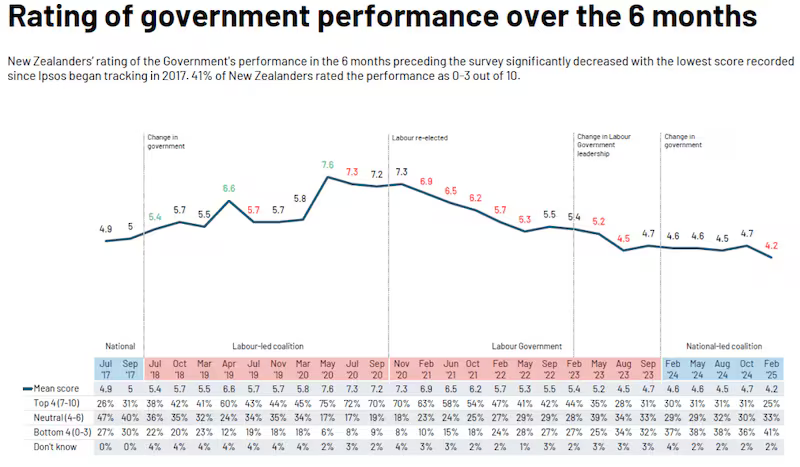 ਸਰਵੇਖਣ ਵਿੱਚ ਸ਼ਾਮਲ 41٪ ਲੋਕਾਂ ਨੇ 10 ਵਿੱਚੋਂ 3 ਜਾਂ ਇਸ ਤੋਂ ਘੱਟ ਰੇਟਿੰਗ ਦਿੱਤੀ। ਇਸ ਤੋਂ ਪਹਿਲਾਂ ਅਗਸਤ 2023 ‘ਚ ਸਭ ਤੋਂ ਘੱਟ ਰੇਟਿੰਗ 4.5 ਸੀ, ਜੋ ਅਕਤੂਬਰ ‘ਚ ਹੋਣ ਵਾਲੀਆਂ ਚੋਣਾਂ ਤੋਂ ਠੀਕ ਪਹਿਲਾਂ ਸੀ। ਨੈਸ਼ਨਲ ਨੂੰ ਅਜੇ ਵੀ ਮਹਿੰਗਾਈ, ਆਰਥਿਕਤਾ ਅਤੇ ਅਪਰਾਧ ਦਾ ਪ੍ਰਬੰਧਨ ਕਰਨ ਦੇ ਸਭ ਤੋਂ ਵਧੀਆ ਸਮਰੱਥ ਪਾਰਟੀ ਵਜੋਂ ਦੇਖਿਆ ਜਾਂਦਾ ਹੈ – ਹਾਲਾਂਕਿ ਲੇਬਰ ‘ਤੇ ਇਸ ਦੀ ਲੀਡ ਤਿੰਨਾਂ ਉਪਾਵਾਂ ‘ਤੇ ਘੱਟ ਰਹੀ ਹੈ. ਮਹਿੰਗਾਈ ਦੀ ਸਭ ਤੋਂ ਵੱਡੀ ਚਿੰਤਾ ‘ਤੇ, 32٪ ਲੋਕਾਂ ਨੇ ਮਹਿਸੂਸ ਕੀਤਾ ਕਿ ਨੈਸ਼ਨਲ ਇਸ ਮੁੱਦੇ ਨਾਲ ਨਜਿੱਠਣ ਦੇ ਸਭ ਤੋਂ ਵਧੀਆ ਯੋਗ ਹੈ, ਜੋ ਅਕਤੂਬਰ ਵਿੱਚ 35٪ ਸੀ। ਲੇਬਰ ਪਾਰਟੀ ਦੀ ਰੇਟਿੰਗ ਵੀ ਡਿੱਗ ਗਈ, ਪਰ ਘੱਟ – 30٪ ਤੋਂ 28٪ ਤੱਕ।