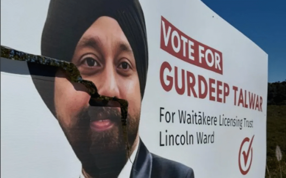 ਆਕਲੈਂਡ (ਐੱਨ ਜੈੱਡ ਤਸਵੀਰ) ਪੱਛਮੀ ਆਕਲੈਂਡ ਵਿੱਚ ਇੱਕ ਭਾਰਤੀ ਮੂਲ ਦੇ ਲਾਇਸੈਂਸਿੰਗ ਟਰੱਸਟ ਉਮੀਦਵਾਰ ਨੂੰ ਭੰਨਤੋੜ ਕਾਰਨ ਦੋ ਦਿਨਾਂ ਵਿੱਚ ਚਾਰ ਵਾਰ ਆਪਣੇ ਪ੍ਰਚਾਰ ਲਈ ਪ੍ਰਚਾਰ ਹੋਰਡਿੰਗ ਬਦਲਣ ਲਈ ਮਜਬੂਰ ਹੋਣਾ ਪਿਆ ਹੈ। ਵੈਟਾਕੇਰੇ ਐਥਨਿਕ ਬੋਰਡ ਦੇ ਪ੍ਰਧਾਨ ਗੁਰਦੀਪ ਤਲਵਾਰ, ਜੋ ਕਿ ਇੱਕ ਆਜ਼ਾਦ ਉਮੀਦਵਾਰ ਵਜੋਂ ਵੈਟਾਕੇਰੇ ਲਾਇਸੈਂਸਿੰਗ ਟਰੱਸਟ ਦੀ ਲਿੰਕਨ ਵਾਰਡ ਸੀਟ ਤੋਂ ਚੋਣ ਲੜ ਰਹੇ ਹਨ, ਨੇ ਕਿਹਾ ਕਿ ਮੈਸੀ ਵਿੱਚ ਤਿੰਨ ਥਾਵਾਂ ‘ਤੇ ਪ੍ਰਚਾਰ ਬੋਰਡਾਂ ਨੂੰ ਕੁੱਲ ਮਿਲਾਕੇ ਨੁਕਸਾਨ $2000 ਤੋਂ ਵੱਧ ਦਾ ਨੁਕਸਾਨ ਹੋਇਆ ਹੈ।