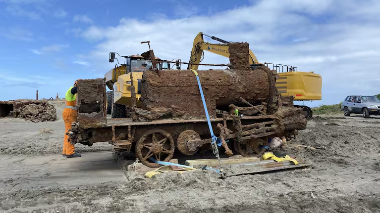 ਇਸ ਰੇਲ ਇੰਜਨ ਨੂੰ ਵੀਰਵਾਰ ਨੂੰ ਰੇਤ ਵਿਚੋਂ ਕੱਢਿਆ ਗਿਆ ਅਤੇ ਜਾਂਚ ਲਈ Steam Rail Whanganui ਦੇ ਯਾਰਡ ‘ਚ ਭੇਜਿਆ ਗਿਆ ਹੈ।