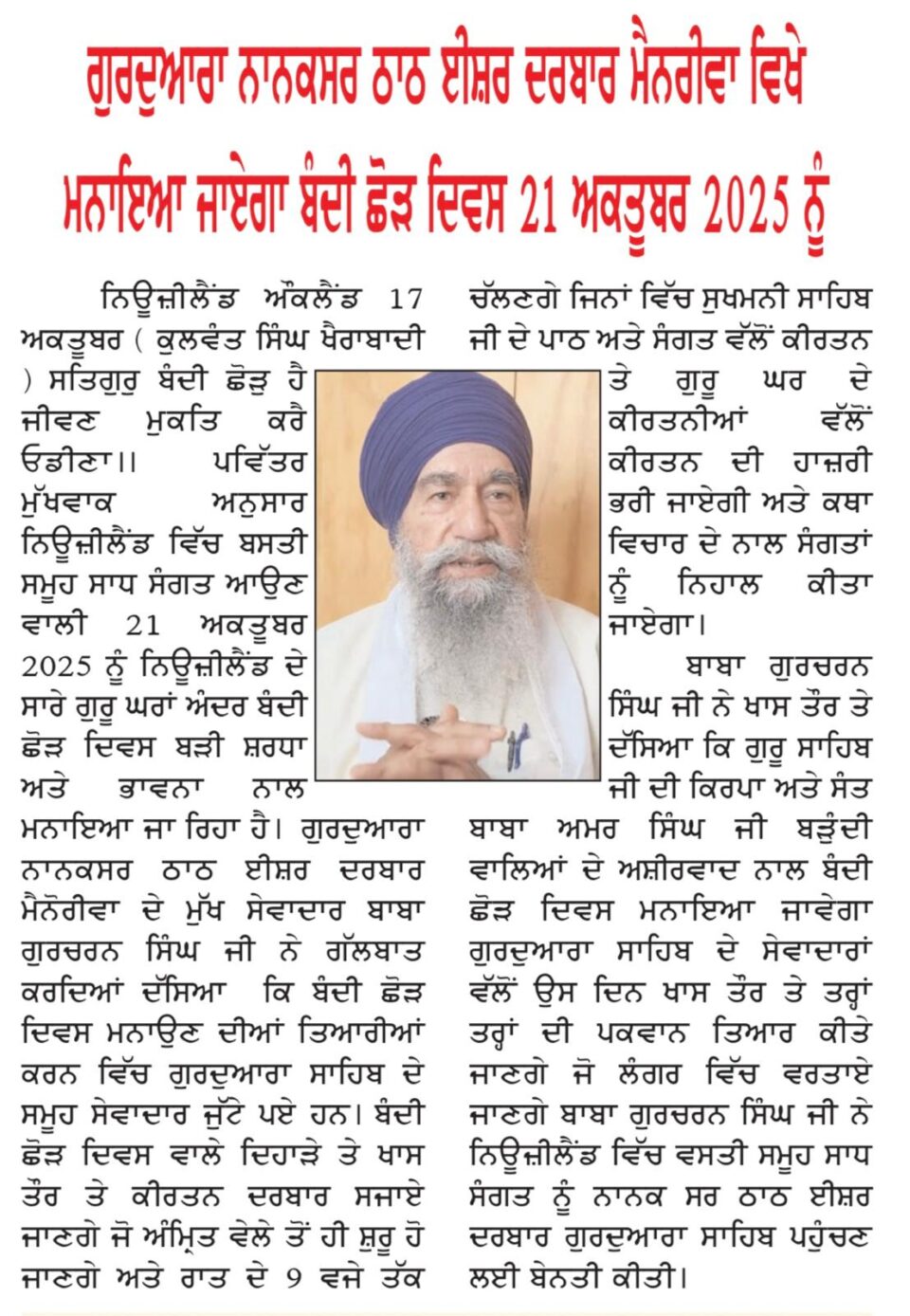ਨਿਊਜ਼ੀਲੈਂਡ ਔਕਲੈਂਡ 17 ਅਕਤੂਬਰ ( ਕੁਲਵੰਤ ਸਿੰਘ ਖੈਰਾਬਾਦੀ ) ਸਤਿਗੁਰੁ ਬੰਦੀ ਛੋੜੁ ਹੈ। ਜੀਵਣ ਮੁਕਤਿ ਕਰੈ ਓਡੀਣਾ॥ ਪਵਿੱਤਰ ਅਨੁਸਾਰ ਸਮੂਹ ਸਾਧ ਸੰਗਤ ਆਉਣ ਮੁੱਖਵਾਕ ਨਿਊਜ਼ੀਲੈਂਡ ਵਿੱਚ ਬਸਤੀ ਵਾਲੀ 21 ਅਕਤੂਬਰ 2025 ਨੂੰ ਨਿਊਜ਼ੀਲੈਂਡ ਦੇ ਸਾਰੇ ਗੁਰੂ ਘਰਾਂ ਅੰਦਰ ਬੰਦੀ ਛੋੜ ਦਿਵਸ ਬੜੀ ਸ਼ਰਧਾ ਅਤੇ ਭਾਵਨਾ ਨਾਲ ਮਨਾਇਆ ਜਾ ਰਿਹਾ ਹੈ। ਗੁਰਦੁਆਰਾ ਨਾਨਕਸਰ ਠਾਠ ਈਸ਼ਰ ਦਰਬਾਰ ਮੈਨੋਰੀਵਾ ਦੇ ਮੁੱਖ ਸੇਵਾਦਾਰ ਬਾਬਾ ਗੁਰਚਰਨ ਸਿੰਘ ਜੀ ਨੇ ਗੱਲਬਾਤ ਕਰਦਿਆਂ ਦੱਸਿਆ ਕਿ ਬੰਦੀ ਛੋੜ ਦਿਵਸ ਮਨਾਉਣ ਦੀਆਂ ਤਿਆਰੀਆਂ ਕਰਨ ਵਿੱਚ ਗੁਰਦੁਆਰਾ ਸਾਹਿਬ ਦੇ ਸਮੂਹ ਸੇਵਾਦਾਰ ਜੁੱਟੇ ਪਏ ਹਨ। ਬੰਦੀ ਛੋੜ ਦਿਵਸ ਵਾਲੇ ਦਿਹਾੜੇ ਤੇ ਖਾਸ ਤੌਰ ਤੇ ਕੀਰਤਨ ਦਰਬਾਰ ਸਜਾਏ ਜਾਣਗੇ ਜੋ ਅੰਮ੍ਰਿਤ ਵੇਲੇ ਤੋਂ ਹੀ ਸ਼ੁਰੂ ਹੋ ਜਾਣਗੇ ਅਤੇ ਰਾਤ ਦੇ 9 ਵਜੇ ਤੱਕ