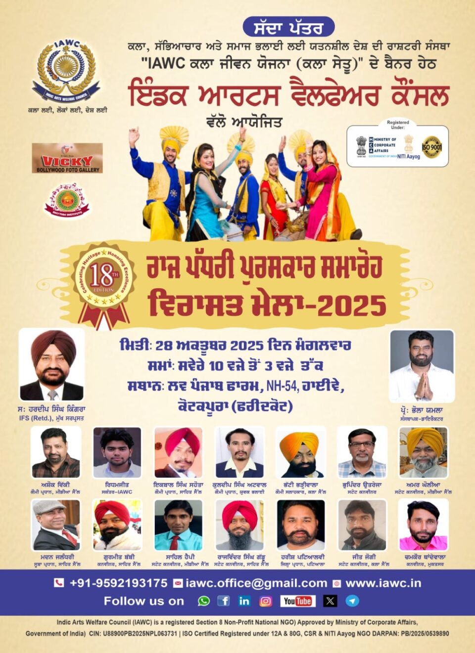 22 ਅਕਤੂਬਰ —( ) ਭਾਰਤ ਦੀ ਪ੍ਰਮੁੱਖ ਸੱਭਿਆਚਾਰਕ ਤੇ ਸਮਾਜਿਕ ਸੰਸਥਾ ਇੰਡਕ ਆਰਟਸ ਵੈਲਫੇਅਰ ਕੌਂਸਲ (Indic Arts Welfare Council – IAWC) ਵੱਲੋਂ 18ਵਾਂ ਰਾਜ ਪੱਧਰੀ ਸਟੇਟ ਅਵਾਰਡ ਅਤੇ ਵਿਰਾਸਤ ਮੇਲਾ-2025 ਮਿਤੀ 28 ਅਕਤੂਬਰ 2025 ਨੂੰ ਲਵ ਪੰਜਾਬ ਫਾਰਮ, ਨੈਸ਼ਨਲ ਹਾਈਵੇ 54, ਕੋਟਕਪੂਰਾ ਵਿਖੇ ਧੂਮਧਾਮ ਨਾਲ ਆਯੋਜਿਤ ਕੀਤਾ ਜਾ ਰਿਹਾ ਹੈ।