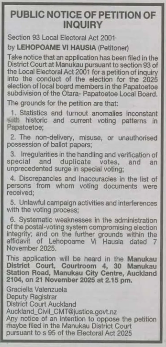 ਓਟਾਰਾ–ਪਾਪਾਟੋਟੋਏਟੋਏ ਲੋਕਲ ਬੋਰਡ ਦੇ ਇੱਕ ਸਾਬਕਾ ਮੈਂਬਰ ਨੇ 2025 ਦੀ ਪਾਪਾਟੋਟੋਏਟੋਏ ਲੋਕਲ ਚੋਣ ’ਤੇ ਨਿਆਂਇਕ ਜਾਂਚ ਦੀ ਮੰਗ ਕਰਦਿਆਂ ਮੈਨਕਾਊ ਜ਼ਿਲ੍ਹਾ ਅਦਾਲਤ ਵਿੱਚ ਪਟੀਸ਼ਨ ਦਾਇਰ ਕੀਤੀ ਹੈ।