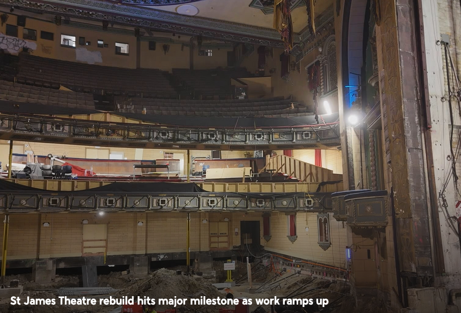 ਆਕਲੈਂਡ(ਐੱਨ ਜੈੱਡ ਤਸਵੀਰ) ਸ਼ਹਿਰ ਦੇ ਇਤਿਹਾਸਕ ਅਤੇ ਸੱਭਿਆਚਾਰਕ ਨਿਸ਼ਾਨ St James Theatre ਦੀ ਮੁੜ ਬਹਾਲੀ ਦੇ ਕੰਮ ਵਿੱਚ ਵੱਡੀ ਪ੍ਰਗਤੀ ਦਰਜ ਕੀਤੀ ਗਈ ਹੈ। ਲੰਮੇ ਸਮੇਂ ਤੋਂ ਰੁਕੇ ਇਸ ਪ੍ਰੋਜੈਕਟ ਨੇ ਹੁਣ ਇੱਕ ਮਹੱਤਵਪੂਰਨ ਮੀਲ ਪੱਥਰ ਪਾਰ ਕਰ ਲਿਆ ਹੈ, ਜਿਸ ਤੋਂ ਬਾਅਦ ਨਿਰਮਾਣ ਕਾਰਜ ਨੂੰ ਤੇਜ਼ੀ ਨਾਲ ਅੱਗੇ ਵਧਾਇਆ ਜਾ ਰਿਹਾ ਹੈ।