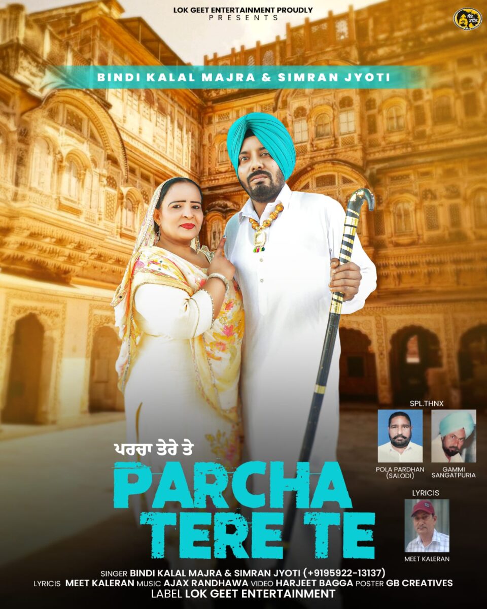 ਪੰਜਾਬ ਦੀ ਉੱਘੀ ਦੋ ਗਾਣਾ ਜੋੜੀ ” ਬਿੰਦੀ ਕਲਾਲ ਮਾਜਰਾ ਅਤੇ ਸਿਮਰਨ ਜੋਤੀ ” ਦਾ ਨਵਾਂ ਟਰੈਕ ” ਪਰਚਾ ਤੇਰੇ ਤੇ ” ਪ੍ਰਸਿੱਧ ਆਡੀਓ ਕੰਪਨੀ ” ਲੋਕ ਗੀਤ ਐਂਟਰਟੇਨਮੈਂਟ ਵੱਲੋਂ ਪੂਰੀ ਸੱਜ ਧੱਜ ਨਾਲ਼ ਵਿਸ਼ਵ ਭਰ ਦੇ ਸਾਰੇ ਆਡੀਓ ਡਿਜਿਟਲ ਸਾਈਟਾਂ ਅਤੇ ਸਟੋਰਾਂ ਉੱਤੇ ਅਤੇ ਯੂ ਟਿਊਬ ਚੈਨਲ ਉੱਤੇ ਰਿਲੀਜ਼ ਕੀਤਾ ਹੈ | ” ਪਰਚਾ ਤੇਰੇ ਤੇ ਗੀਤ ਉੱਘੇ ਗੀਤਕਾਰ ਮੀਤ ਕਲੇਰਾਂ ਵੱਲੋਂ ਬਹੁਤ ਵਧੀਆ ਅੰਦਾਜ਼ ਵਿੱਚ ਲਿਖਿਆ ਗਿਆ ਹੈ ਅਤੇ ਇਸ ਟਰੈਕ ਦਾ ਸੰਗੀਤ ਸੰਗੀਤਕਾਰ ਅਜੈਕਸ ਰੰਧਾਵਾ ਨੇ ਗੀਤ ਦੇ ਬੋਲਾਂ ਨਾਲ਼ ਪੂਰਾ ਢੁੱਕਵਾਂ ਤਿਆਰ ਕੀਤਾ ਹੈ ਜਿਸਨੂੰ ਕਿ ਸਰੋਤੇ ਬਹੁਤ ਪਸੰਦ ਕਰ ਰਹੇ ਹਨ | ਗੀਤ ਦਾ ਵੀਡੀਓ ਖੰਨੇ ਲਾਗਲੇ ਪਿੰਡ ਸਲੌਦੀ ਵਿਖ਼ੇ ਪੋਲੇ ਪ੍ਰਧਾਨ ਦੀ ਕੋਠੀ ਅਤੇ ਫ਼ਾਰਮ ਤੇ ਵੀਡੀਓ ਡਾਇਰੈਕਟਰ ਹਰਜੀਤ ਬੱਗਾ ਨੇ ਪੂਰੀ ਮਿਹਨਤ ਅਤੇ ਲਗਨ ਨਾਲ਼ ਤਿਆਰ ਕੀਤਾ ਹੈ ਵੀਡੀਓ ਵਿੱਚ ਸ਼ਸ਼ੀ ਵਰਧਨ ( ਚਾਚਾ ) ਨੇ ਵਿਸ਼ੇਸ਼ ਰੋਲ ਕੀਤਾ ਹੈ | ਜੋ ਲੋਕਾਂ ਦੀਆਂ ਉਮੀਦਾਂ ਤੇ ਪੂਰਾ ਉੱਤਰ ਰਿਹਾ ਹੈ |