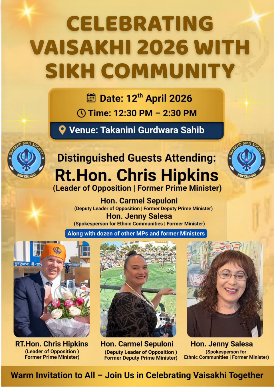 ਇਸ ਮੌਕੇ ‘ਤੇ Supreme Sikh Society of New Zealand ਵੱਲੋਂ ਸਾਰੇ ਭਾਈਚਾਰੇ ਨੂੰ ਸਮਾਗਮ ਵਿੱਚ ਵੱਡੀ ਗਿਣਤੀ ਵਿੱਚ ਸ਼ਾਮਿਲ ਹੋਣ ਦਾ ਸੱਦਾ ਦਿੱਤਾ ਗਿਆ ਹੈ, ਤਾਂ ਜੋ ਵਿਸਾਖੀ ਦੀਆਂ ਖੁਸ਼ੀਆਂ ਸਾਂਝੀਆਂ ਕੀਤੀਆਂ ਜਾ ਸਕਣ।